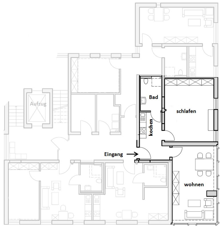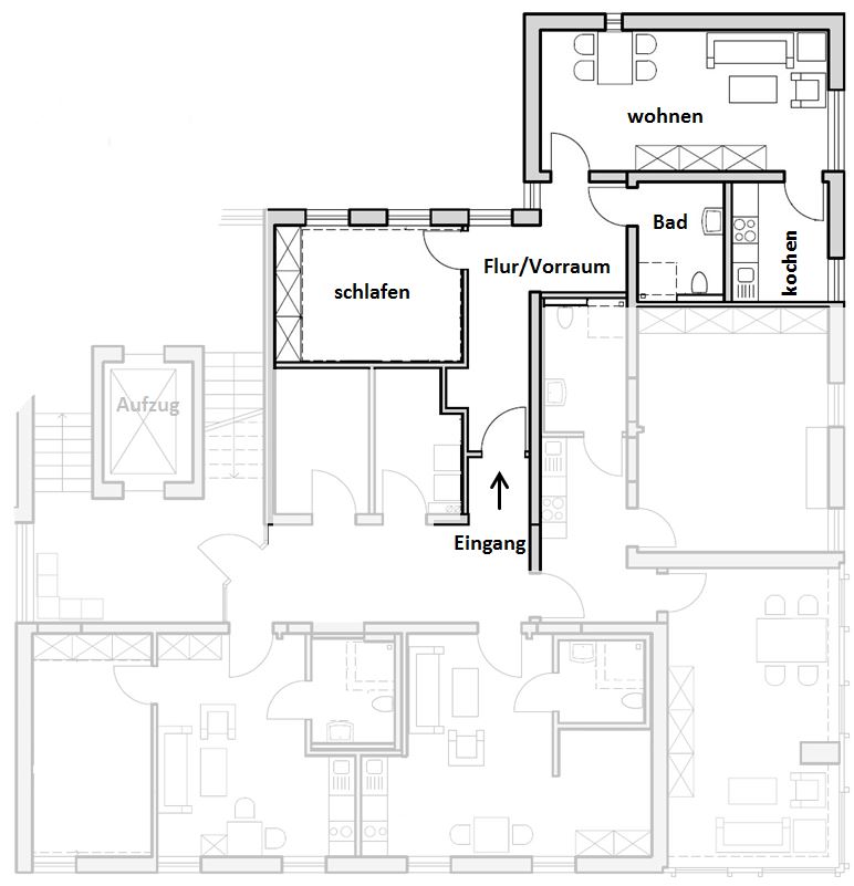 2 Zimmer (ca. 58 m²), Wohnzimmer, Schlafzimmer, Küche, Bad (Dusche, WC, Waschplatz), Flur/Vorraum