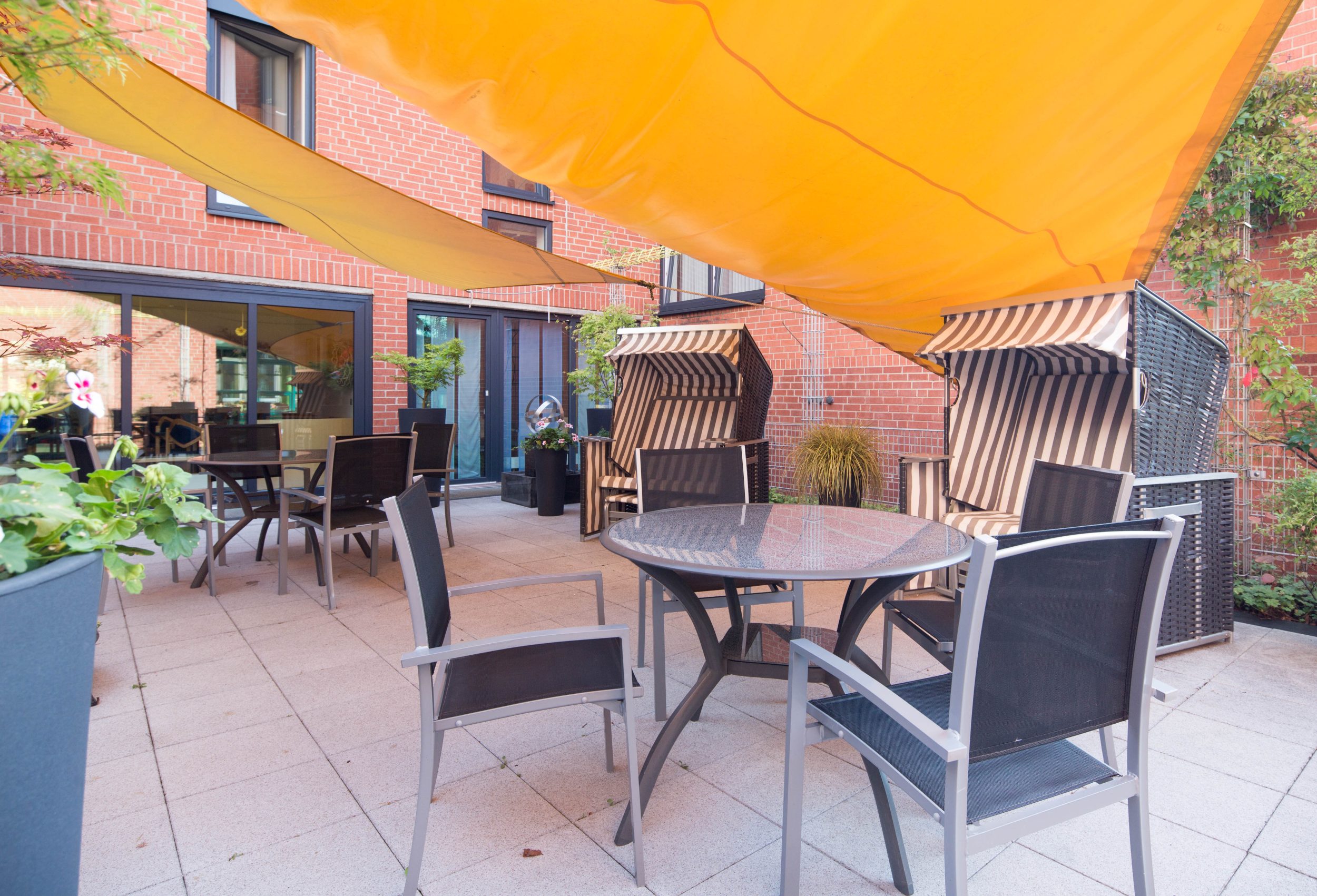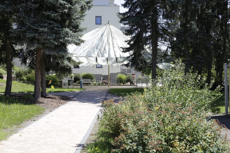 Zur Einrichtung gehört auch eine liebevoll gestaltete, geschützte Parkanlage mit Festplatz, Pavillon, Hochbeeten, Hühnerhaus und Vogelvoliere. Viele Pflanzen, Sträucher und Bäume sowie rollstuhlgerechte Wege und seniorengerechte Sitzplätze laden zu Spaziergängen, Begegnungen und entspannten Momenten im Freien ein.